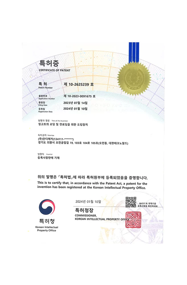 특허증 - 잉고트의 로딩 및 언로딩을 위한 도킹장치