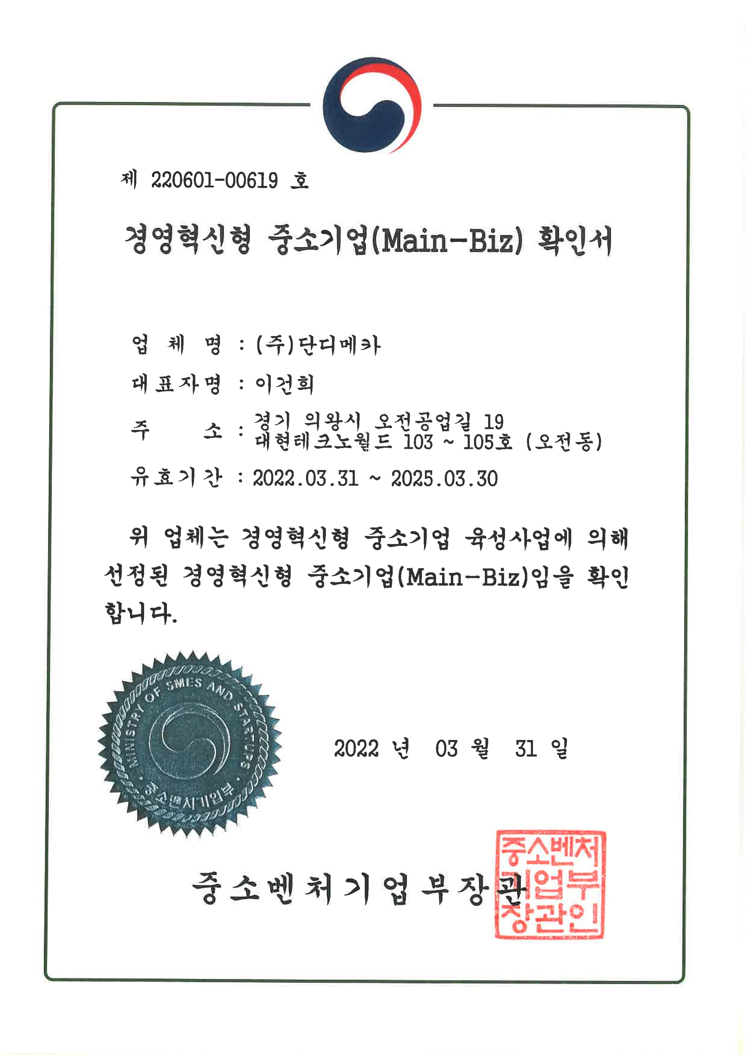 경영혁신형 중소기업 (Main-Biz) 확인서
