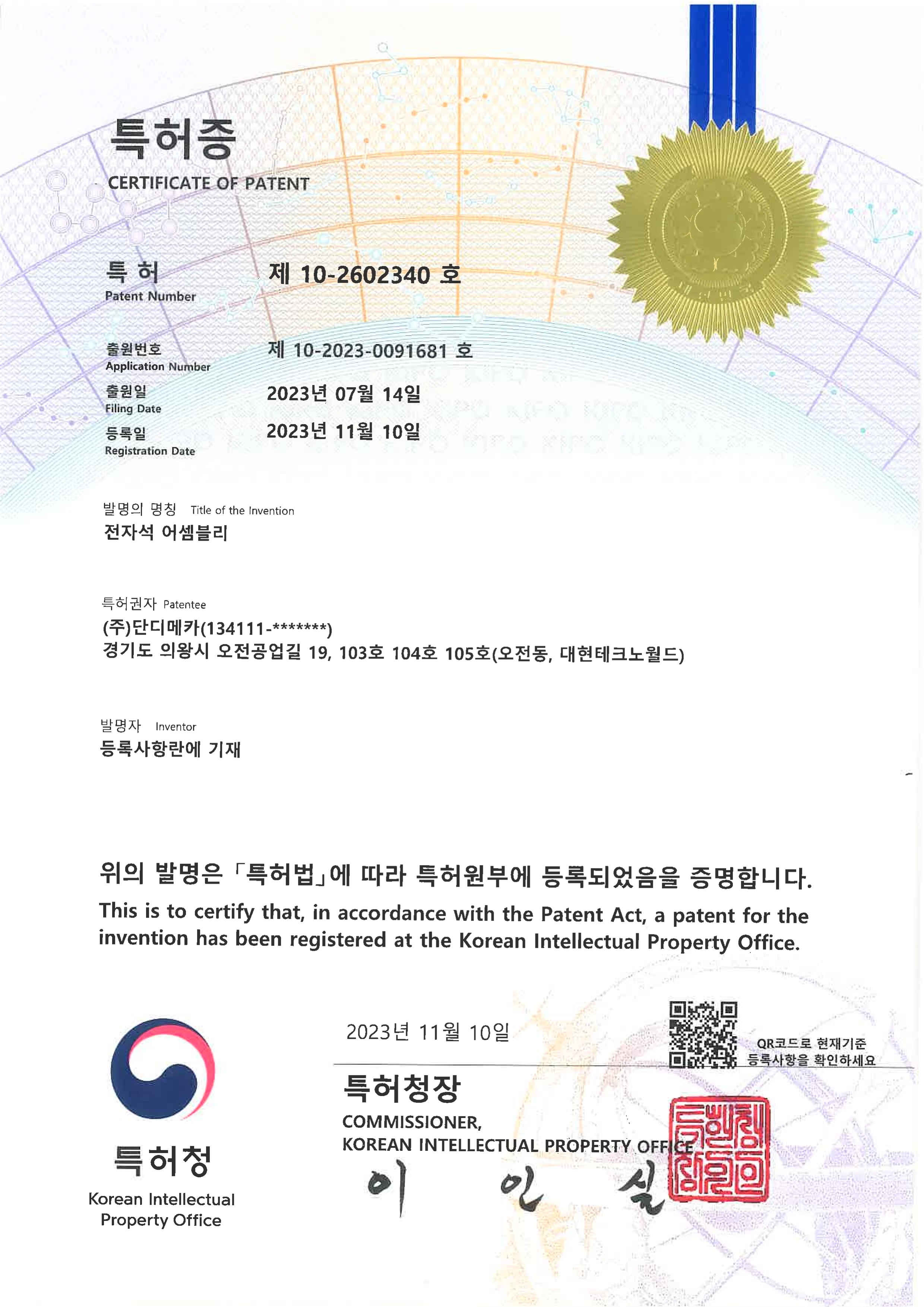 특허증 - 전자석 어셈블리