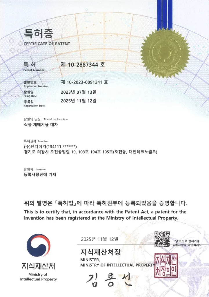 특허증 - 식물재배기용 대차